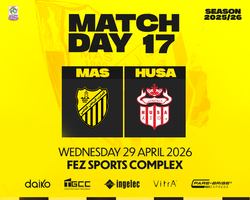 Pour le compte de la 17ème journée de la BOTOLA PRO INWI, Le Maghreb Association Sportive recoit Hassania Union Sport d'Agadir le Mercredi 29 avril 2026 à 20h au GRAND STADE DE FES